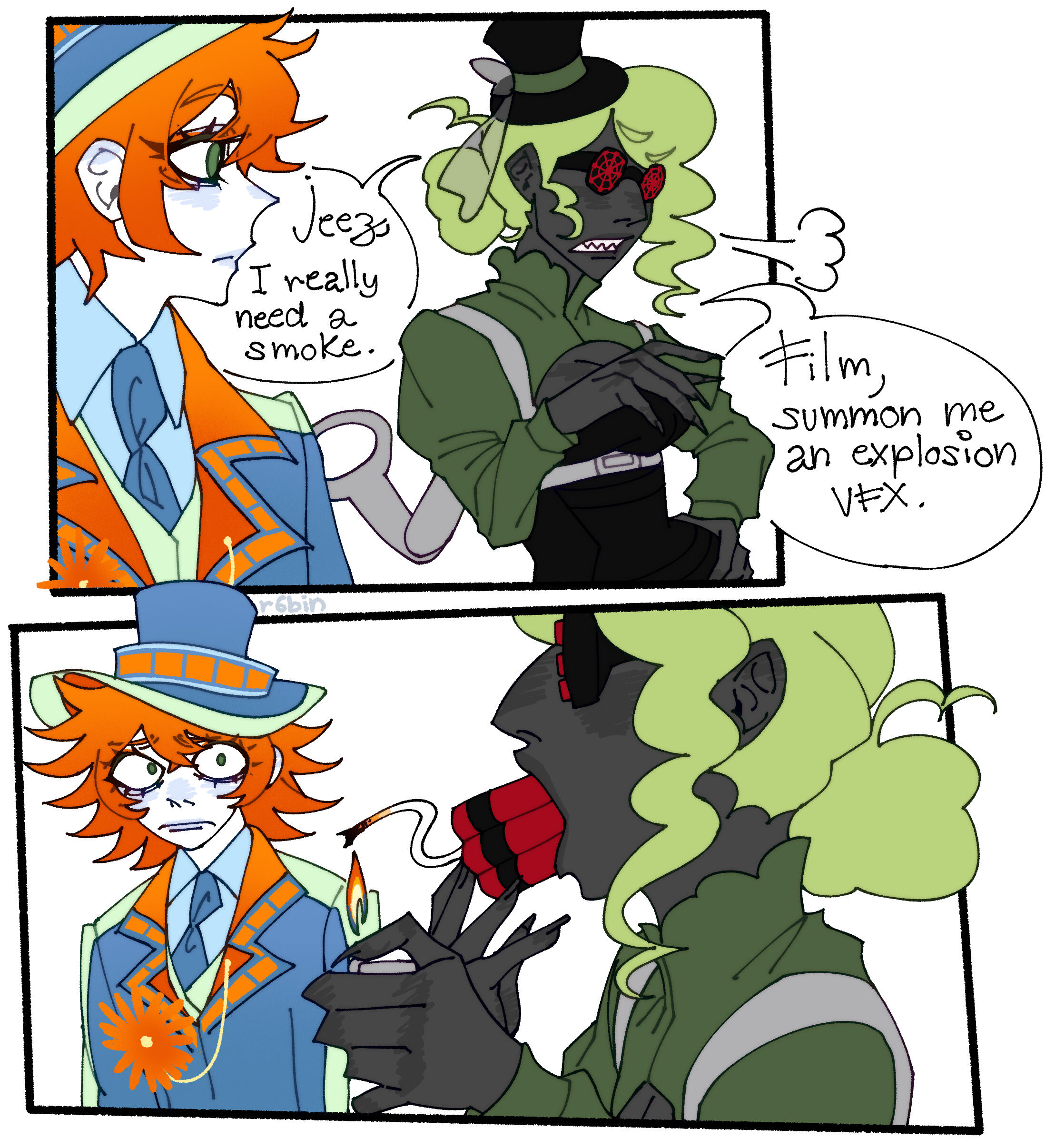 Vapor hates being still. She's always doing something; be it cartwheeling down the street, speedrunning laps around town or pestering someone, especially Interweb, who she thinks 'stays too much time in his house'.