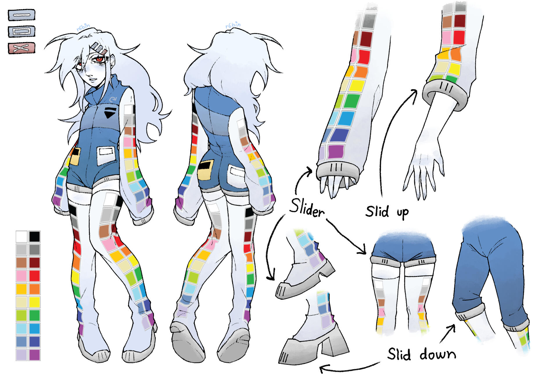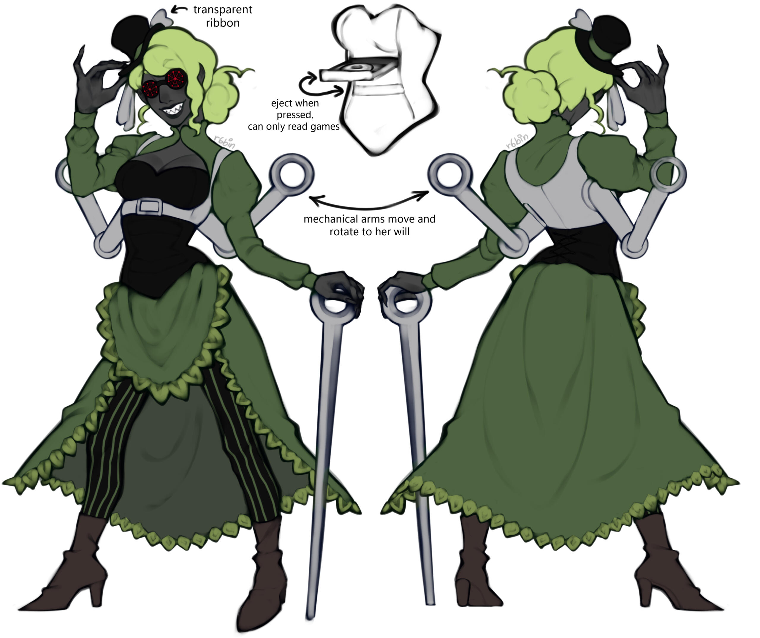 Vapor's unique abilities come from inserting video game disks into the ejectable trays of her corset; think of it like when Mario transforms after getting power-ups such as leaves and flowers. Depending on the game she chooses, her outfit changes and she gets a prop from chosen game. Even when Vapor's outfit changes, she'll always have the disk trays.